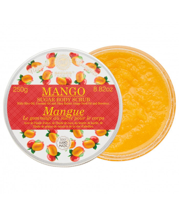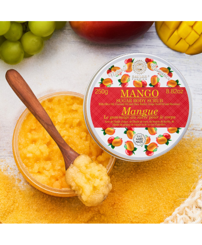 Saules Exfoliant Corp cu Zahar aroma de Mango 250gSaules Exfoliant corporal cu Zahăr cu aroma de Mango, îndepărtează ușor celulele moarte ale pielii, îmbunătățește circulația sângelui și stimulează metabolismul celular. După utilizare, pielea devine netedă și elastică, tonusul său se îmbunătățește. Exfoliantul este îmbogățit cu ulei de măsline, ulei de cocos, unt de shea, ulei de semințe de struguri și ceară de albine.Fara silicon, parabeni si coloranti artificiali.Produs 100% hand made.Ingrediente active: ceara de albine, ulei de masline, ulei de nuca de cocos, unt de shea, ulei de samburi de struguri.Ceara de albine hidratează pielea, o protejează împotriva factorilor externi, reține umiditatea, îmbunătățește circulația intercelulară, oferă un aspect proaspăt, sănătos și tonifică pielea. Are efect de regenerare și întinerire și netezește ridurile.Uleiul de măsline hidratează pielea, o face mai elastică și mai netedă, stimulează regenerarea celulelor pielii și întinerirea.Uleiul de cocos stimulează regenerarea celulelor pielii, hrănește și hidratează, face pielea mai elastică și mai mătăsoasă.Untul de Shea hidratează, hrănește, restaurează, vindecă, întinerește și protejează pielea. Înmoaie stratul de suprafață al epidermei, făcându-l mai elastic.Uleiul din semințe de struguri ajută la întinerirea pielii, făcând-o mai netedă, mai fermă și mai elastică.Mod de utilizare:Aplicați Saules Exfoliant corporal cu Zahăr cu aroma de Mango pe pielea curata, umedă cu mișcări ușoare de masaj, acordând o atenție deosebită zonelor problematice, apoi clătiți cu apă caldă.Nu este recomandat după bărbierit, epilare și pe zonele cu rana deschisa, sau pielea expusa sau arsa de soare.Ingrediente: Zaharoză, ulei de semințe de Vitis Vinifera(struguri), unt de Butyrospermum Parkii (Shea), Ceara Alba, Ulei de Cocos Nucifera, Ulei de fructe Olea Europea (Măsline), Parfum, Geraniol, Hexyl Cinnamal, CI 19140, CI 15985...