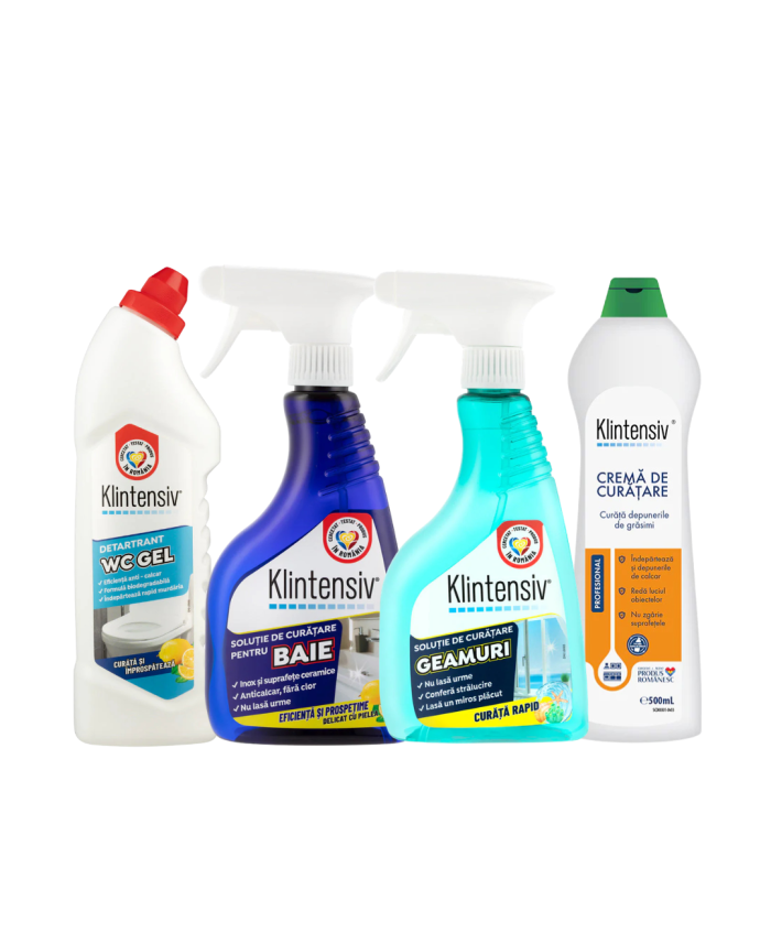 Klintensiv Pachet Curățare Baie Pachet solutii profesionale pentru curatare baie. Pachetul cuprinde:1* Klintensiv Soluție Curățare Baie 500 ml1* Klintensiv Gel Detartrant WC Suprafețe Ceramice 750ml1* Klintensiv Cremă Profesională de Curățare 500ml1* Klintensiv Soluție Curățare Geamuri 500mlKlintensiv Soluție Curățare Baie 500 ml - soluție profesională pentru îndepărtarea rapidă a calcarului, urmelor de apă și murdăriei din baie. Curăță eficient fără a lăsa urme și protejează suprafețele împotriva re-depunerilor, menținând strălucirea mai mult timp.Îndepărtează calcarul & murdăria fără efortNu lasă urme – aspect îngrijit, luciosCompatibilă cu: gresie, faianță, ceramică, căzi, cabine de duș, robinete/bateriiEfect de protecție împotriva re-depunerilorPotrivită pentru uz casnic & profesional (hoteluri, clinici, spa-uri)Klintensiv Gel Detartrant WC Suprafețe Ceramice 750ml - gel detartrant profesional, cu aderență crescută pe suprafețe verticale, conceput pentru îndepărtarea rapidă a calcarului, urmelor de apă, murdăriei și petelor persistente. Acționează în profunzime, fără a deteriora suportul și lasă un finisaj curat, lucios.Îndepărtează rapid calcarul și depunerile dificileAderență superioară datorită texturii gel – timp de contact mai lungBarieră anti-calcar – suprafețe curate mai mult timpPoate fi utilizat ca atare sau diluatAplicare ușoară, rezultate vizibile, fără efortKlintensiv Cremă Profesională de Curățare 500ml - această cremă de curățare este soluția ideală pentru întreținerea zilnică și curățenia intensă a suprafețelor din inox, email, ceramică sau alte metale rezistente la acid. Formula sa avansată îndepărtează rapid amprentele, grăsimile și depunerile de calcar, fără a zgâria suprafețele.✔ Degresează eficient: dizolvă chiar și cele mai persistente pete de ulei și grăsimi✔ Redă luciul natural al suprafețelor din inox, ceramică sau sticlă✔ Nu zgârie: formulă cremoasă, sigură pentru utilizare frecventă✔ Elimină calcarul și murdăria minerală cu ușurință✔ Spumă densă, economică, cu parfum plăcut de lămâieKlintensiv Soluție Curățare Geamuri 500ml - formulă profesională pentru sticlă și suprafețe lucioase, concepută să îndepărteze rapid pete, amprente și murdărie. Se evaporă rapid, nu lasă urme sau reziduuri și conferă efect antistatic pentru o transparență de durată.Curățare eficientă, fără urme & fără clătireUscare rapidă și efect antistaticIdeală pentru geamuri, oglinzi, vitrine, ecrane TV/monitoare, suprafețe lucioasePentru interior & exterior – locuințe, birouri, spații comercialeUșor de folosit, rezultate vizibile de la prima aplicareAvertizări & precauțiiNu amestecați cu înălbitori/hipoclorit sau alte produse chimice.Utilizați mănuși; evitați contactul prelungit cu pielea și ochii.Asigurați ventilarea încăperii în timpul utilizării.A nu se lăsa la îndemâna copiilor.În caz de contact cu ochii, clătiți imediat cu multă apă.Nu ingerați.Siguranță în utilizareNu utiliza..