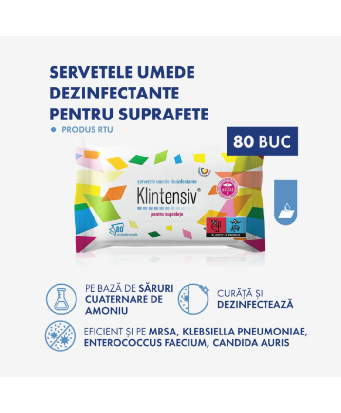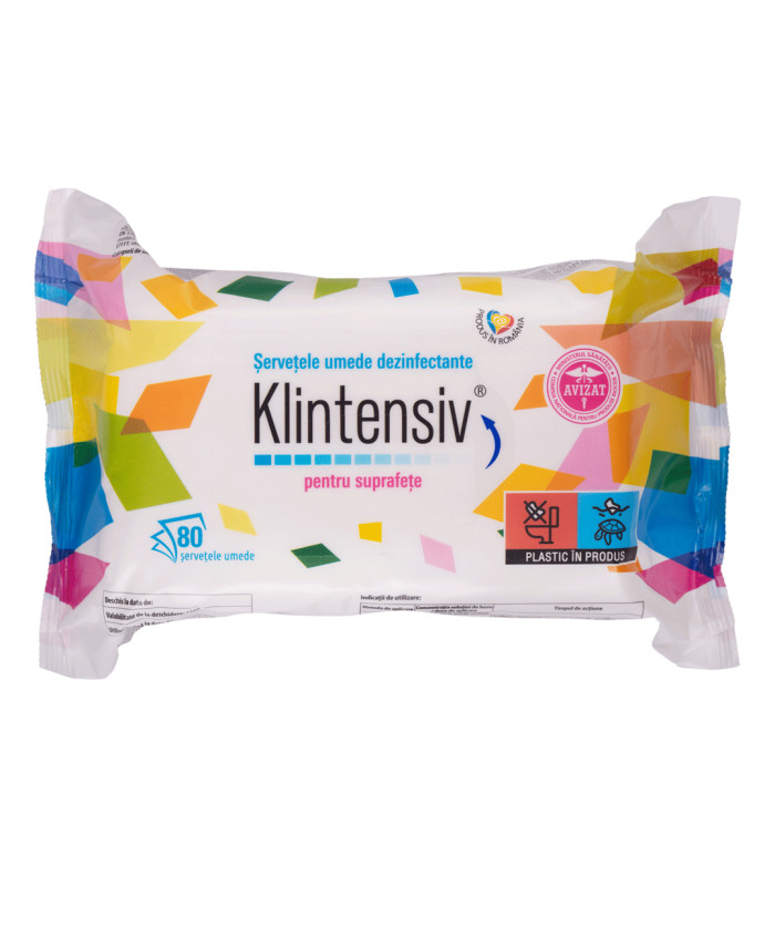 KLINTENSIV® – Servetele umede dezinfectante pentru suprafete, 80 buc.ȘERVEȚELE UMEDE DEZINFECTANTE au proprietăți detergente și dezinfectante cu un spectru larg de acțiune biocidă, fiind recomandate pentru orice tip de suprafață, inclusiv pentru cele delicate și opacizante, sensibile la atacul chimic al soluțiilor cu bază alcoolică. Pot fi folosite și la dezinfectarea instrumentarului și a dispozitivelor medicale utilizate în scop de diagnostic (electrozi EKG, stetoscop, sonde ecografice, brățări pentru monitorizarea funcțiilor vitale, mese de consult ș.a.). Se pot utiliza în domeniul medical (spitale, clinici, laboratoare, policlinici, cabinete medicale, ambulanțe, inclusiv în zonele de birou ale acestora sau în cele de cantină), industria farmaceutică și cosmetică, dar și în domeniile public și privat sau casnic.Special concepute pentru curățarea și dezinfectarea suprafețelor, fără riscuri de contaminareUtilizare ușoară cu eficiență ridicată în dezinfectareSpectru larg de acțiune biocidă, inclusiv pe tulpinile MRSA, Enterococcus faecium, Klebsiella pneumoniae, Candida aurisCompatibile cu suprafețe multipleAviz emis de Comisia Națională pentru Produse Biocide nr. 2394BIO/02/12.30Încadrarea produsului biocid: Grupa principală: 1; Tipul de produs: 2.Categorie de utilizatori: Profesionali, industriali, populație. Compoziție chimică la 100 g produs:Ingrediente active: 0,34% (m/m) Clorură de didecildimetilamoniu (CAS:7173-51-5; CE: 230-525-2); 0,09% (m/m) Compuși de amoniu cuaternar, benzil-C12-18-alchildimetil, cloruri (CAS: 68391-01-5; CE: 269-919-4).Alte ingrediente: <5% surfactanți nonionici, agent de chelatizare, parfum, apă. Proprietăți produs:Eficiență demonstrată inclusiv în condiții de murdărieConțin agenți tensioactivi cu capacitate bună de curățare și spumare redusăNu necesită clătire după utilizareAmbalaj impermeabil și rezistentConform testării EN 14476 pe Vaccinia Virus produsul prezintă activitate biocidă și pe următoarele tipuri de tulpini virale: Filoviridae, Flavivirus, Herpesviridae, Hepatitis B virus (HBV), Hepatitis C virus (HCV), Hepatitis Delta virus (HDV), Human Immunodeficiency virus (HIV), Human T-cell lymphotropic virus (HTLV), Coronavirus, Influenza virus, Paramyxoviridae, Rubella virus, Measles virus, Rabies virus, Poxviridae. Mod de utilizare:Produsul se utilizează ca atare, pe suprafețe curate/murdare, având acțiune rapidă.Pentru dezinfectarea suprafețelor se folosește o cantitate suficientă pentru acoperirea totală a acestora (consum 2 șervețele / 1 m2). Se șterge suprafața și se lasă să acționeze între 5-60 minute, în funcție de nivelul de dezinfectare dorit. Nu necesită clatire.Pentru dezinfectarea instrumentarului/dispozitivelor medicale, acestea se curăță, se usucă, apoi se folosește o cantitate suficientă pentru acoperirea totală a acestora cu un film de lichid, iar timpul de contact este cuprins între 5-60 minute, în funcție de nivelul de dezinfectare dorit. Ambalare: 80 de bucăți (pachet)..