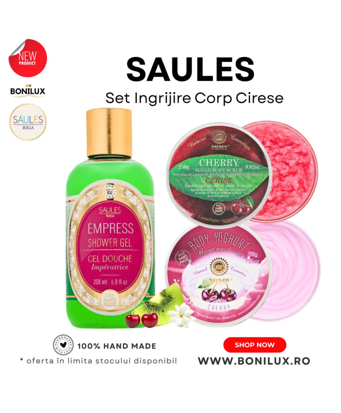 Saules Set Ingrijire Corp CireseSetul cuprinde: 1* Saules Iaurt de corp Cirese 200g - crema ce combina uleiul de migdale intr-o formulă dublu hidratantă, perfecta pentru piele, lăsând-o moale și mătăsoasă. Produsul se absoarbe usor, fara a lasa un luciu uleios. Fantezie de cireșe – aromă dulce și delicioasă de cireșe fragede de grădină. Hidratant și rejuvenant, creând o bună dispoziție pentru întreaga zi.1* Saules Exfoliant Corp cu Zahar - aroma Cirese 250g îndepărtează ușor celulele moarte ale pielii, îmbunătățește circulația sângelui și stimulează metabolismul celular. După utilizare, pielea devine netedă și elastică, tonusul său se îmbunătățește. Exfoliantul este îmbogățit cu ulei de măsline, ulei de cocos, unt de shea, ulei de semințe de struguri și ceară de albine.1* Saules Gel de Duș Empress 200ml - curăță delicat, catifeleaza, asigură nutriția necesară și hidratarea profundă a pielii, prevenind uscarea și descuamarea acesteia, oferă o senzație de lungă durată de prospetime și confort. Pielea devine catifelată, netedă și elastică. Gelul de duș are o aromă plăcută, delicată, ameliorează oboseala și stresul, asigura energie pentru întreaga zi.Produse 100% Hand Made.Fara parabeni, silicon si coloranti artificiali.Fara aditivi si chimicale.Mod de utilizare: aplicati gel de dus pe pielea umeda Saules Empress si masati usor si circular pana la apartitia spumei. Clatiti cu apa din abundenta. Aplicati exfoliantul Saules Exfoliant Corp cu Zahar - aroma de Cirese 250ml pe pielea curata si umeda si masati usor pe piele cu miscari circulare. ( Nu este recomandat după bărbierit, epilare și pe zonele cu rana deschisa, sau pielea expusa sau arsa de soare.) Aplicati Saules Iaurt de corp cu Cirese 200g, si masați cu mișcări circulare moi până când este complet absorbit..