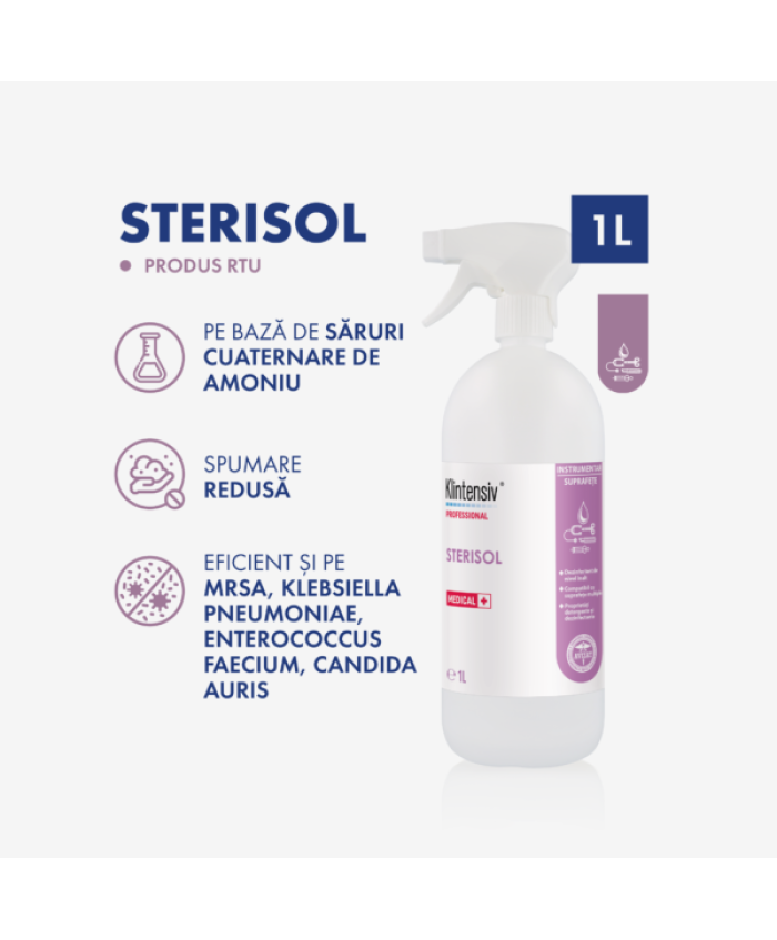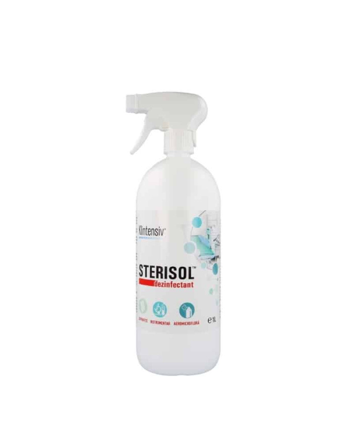 STERISOL este un lichid gata de utilizare pe bază de săruri cuaternare de amoniu, care are proprietăți detergente și dezinfectante cu spectru larg de acțiune biocidă. Este eficient pentru curățarea și dezinfectarea diferitelor tipuri de suprafețe și instrumentar din domeniile medical, industrial, public și privat. Poate fi folosit în băile cu ultrasunete pentru o dezinfectare ușoară a instrumentarului medical. Produsul este ideal pentru utilizarea în spitale, unități de primiri urgențe, centre de triaj, policlinici, clinici și cabinete medicale.