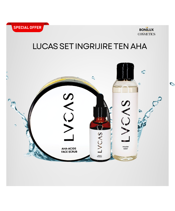 Lucas Set Ingrijire Ten AHASet pentru ingrijirea tenului, fara parabeni si sulfati.Setul cuprinde: 1) Lucas Apa Micelara 150ml - curăță eficient pielea, îndepărtează delicat și delicat machiajul de pe față și pleoape, fără a provoca iritații. Hidratează, oferă o senzație de curățenie și oferă pielii prospețime. Nu necesită clătire. Potrivită pentru toate tipurile de ten. Contine Aloe vera si Bioflavonoide.Fara parabeni, acool, alcaliu, fenoxietanol si parfum!Pentru toate tipurile de ten.2) Lucas Exfoliant Ten AHA - cu acizi -50ml un produs original delicat, dar intens, cu un pH de 4,5, potrivit pentru curățarea delicată și profundă a oricărui tip de ten.Produsul curăță eficient porii, stimulează reînnoirea naturală a celulelor și uniformizează nuanța pielii.Acizii din fructe au un efect de catifelare, hidratare, curățare și tonifiere și cresc elasticitatea pielii.Acidul lactic netezeste ridurile, hidrateaza si tonifica pielea, acidul glicolic uniformizeaza nuanta tenului, netezeste tenul, ajuta in progesul de luminoziate prin usoara depigmentare, curata porii si piele de celulele moarte.Folosirea Exfoliantul Lucas Aha- cu acizi, face pielea netedă și proaspătă, iar porii sunt mai puțin vizibili. 3) Lucas Ser cu Vitamina C 30ml- combate perfect pigmentarea pielii, urmele de acnee, pielea uscată și descuamată, uniformizează textura și tonusul pielii.Pentru toate tipurile de ten.1) Vitamina C – luminează petele pigmentare de pe piele, urmele post-acneice, netezește ridurile de expresie, uniformizează nuanța și textura pielii. Antioxidant puternic.2) Aminoacid din mătase – pătrunde rapid în piele, întinerește, promovează producția de colagen, sinteza proteinelor în piele, îmbunătățește microcirculația în celule și protejează împotriva influențelor dăunătoare ale mediului, precum și a radiațiilor UV.Trehaloza protejează, de asemenea, vitamina E de oxidare.4) Extracte de plante:• Dud – reglează tulburările de pigmentare, inclusiv pe cele legate de vârstă;• Purslane – rar întâlnit în cosmetice. Un agent puternic antiinflamator și rejuvenator, are efect antimicrobian;• Smochină – are efect de lifting și antiinflamator;• Bujor – albește, hrănește și hidratează;• Arnica montana – efect antiinflamator și crește rezistența pielii la factorii externi;5) Niacinamidă (vitamina B3) – crește sinteza colagenului, reduce pielea uscată, elimină petele pigmentare, închide porii, efect antibacterian ușor.Conține 8% vitamina C. Se recomandă utilizarea cremei de protecție solară după utilizare.MOD DE UTILIZARE:Umeziți o dischetă demachiantă cu apă micelară, curățați pielea pana toate reziduurile dispar.Aplicați exfoliantul cu mișcări ușoare de masaj pe pielea uscată și curată a feței, evitând conturul ochilor. Clătiți bine cu apă. Utilizați de 1-2 ori pe săptămână.A se utiliza de 1-2 ori pe săptămână. Nu utilizati pe rani deschise, piele iritata, sau arsa de soare!Aplicati cateva picaturi de Lucas Ser cu Vitamina C, pe fata, gat si decolteu, pe piele umeda, curata, exfoliata in prealabil. Lasati produsul sa se absoarba complet. Apoi aplicati o crema cu factor de protectie SPF...