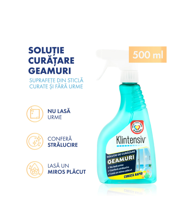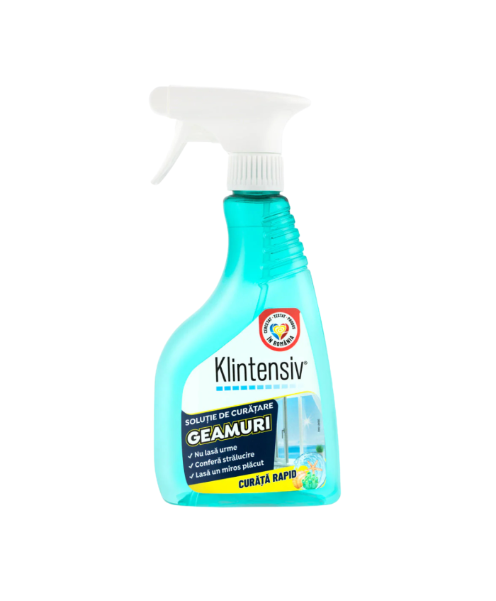 Klintensiv Soluție Curățare Geamuri 500mlFormulă profesională pentru sticlă și suprafețe lucioase, concepută să îndepărteze rapid pete, amprente și murdărie. Se evaporă rapid, nu lasă urme sau reziduuri și conferă efect antistatic pentru o transparență de durată.BeneficiiCurățare eficientă, fără urme & fără clătireUscare rapidă și efect antistaticIdeală pentru geamuri, oglinzi, vitrine, ecrane TV/monitoare, suprafețe lucioasePentru interior & exterior – locuințe, birouri, spații comercialeUșor de folosit, rezultate vizibile de la prima aplicareDomenii de utilizareGeamuri, oglinzi, vitrine, mese din sticlă, uși/glisiere din sticlă, plăci lucioase, inox lucios.Ecrane TV/monitoare: folosiți pe lavetă din microfibră; verificați recomandările producătorului ecranului.Instrucțiuni de utilizarePulverizați pe suprafața rece sau direct pe o lavetă din microfibră.Ștergeți în mișcări line, fără presiune excesivă.Lustruiți cu o lavetă uscată pentru un finisaj perfect, fără urme.Pentru murdărie persistentă: repetați aplicarea.Compatibilitate & recomandăriPotrivită pentru sticlă, oglinzi, vitrine, suprafețe lucioase, inox lucios.Ecrane sensibile (laptop, monitoare, TV cu strat oleofobic): pulverizați doar pe lavetă; nu aplicați exces de lichid la margini/porturi.Test de compatibilitate pe o zonă mică înainte de prima utilizare.Nu utilizați pe suprafețe necompatibile cu soluții pe bază de alcool (dacă este cazul) sau pe ecrane foarte sensibile fără confirmarea producătorului.Avertizări & precauțiiNu amestecați cu alte produse de curățare.Utilizați în spații bine ventilate.Evitați contactul cu ochii; în caz de contact, clătiți imediat cu multă apă.A nu se lăsa la îndemâna copiilor.Nu ingerați.Nu pulverizați direct pe aparate electrice sub tensiune; deconectați înainte de curățare.Siguranță în utilizareNu utilizați produsul dacă este expirat sau în condiții diferite de cele recomandate pe etichetă/fișa tehnică.Ambalare & logisticăFlacon: 500 ml Durabilitate & depozitareDepozitați în recipientul original, bine închis, la 5–30°C, ferit de îngheț și de soare direct.Folosiți în intervalul indicat de PAO/lot de pe ambalaj...