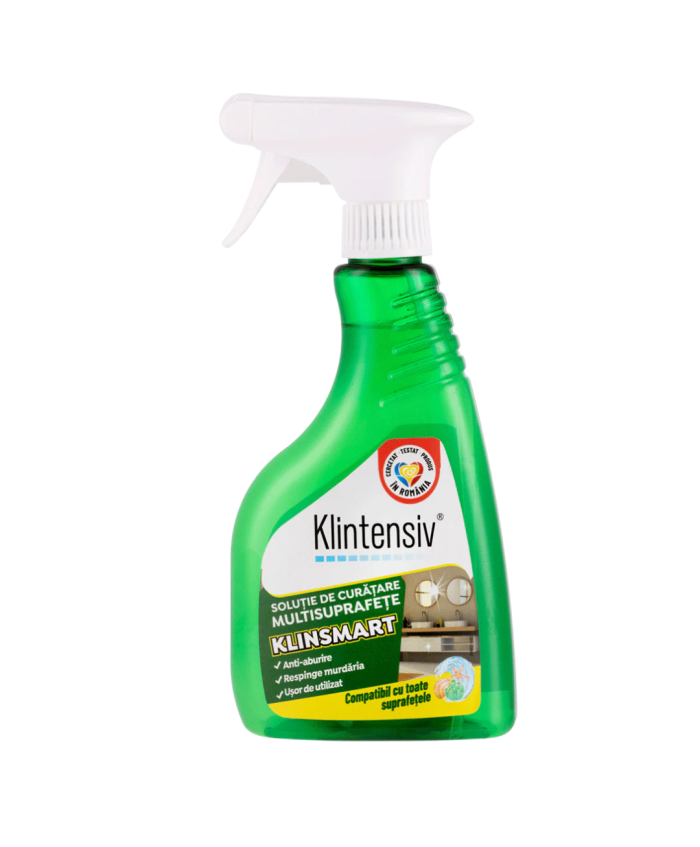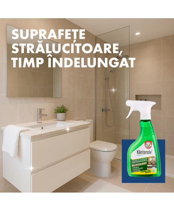 KlinSmart Soluție de Curățare cu Efect Remanent 500mlKlinSmart este o soluție profesională de curățare cu efect remanent, formulată pentru a curăța rapid depunerile și a preveni recontaminarea suprafețelor. Datorită combinației sinergice de surfactanți non-ionici și polimer hidrofilic, produsul formează o peliculă protectoare ce respinge apa, calcarul, grăsimile, mucegaiul și reziduurile de săpun. Curățare eficientă + protecție îndelungată, fără urme sau aspect mat.Fără parabeni. Prietenos cu suprafețele și mediul. Miros discret, proaspăt.BeneficiiCurățare rapidă și eficientă a murdăriei, grăsimii și calcaruluiPeliculă activă ce reduce redepunerea impuritățilorÎndepărtează reziduurile de săpun fără urmePrevine apariția mucegaiului și a depunerilor din baieEfect antiaburire pe oglinzi și suprafețe vitrateProtejează suprafețele și menține luciul naturalReduce timpul alocat curățenieiPotrivit pentru uz casnic și profesionalDomenii de utilizareBaie: cabine duș, oglinzi, baterii sanitare, gresie, faianță, căzi, lavoareBucătărie: blaturi, plite, inox, mobilier, filtre metalice, depuneri de grăsimeSuprafețe vitrate, plasticuri, ceramică, lemn lăcuitZone sensibile la calcar, abur sau murdărie persistentăInstrucțiuni de utilizarePulverizați produsul direct pe suprafață sau pe o lavetă din microfibră.Lăsați să acționeze 2–3 minute (în funcție de gradul de murdărie).Ștergeți cu burete/lavetă umedă sau clătiți cu apă curată.Pentru depuneri dificile, prelungiți timpul de contact sau reaplicați.Nu necesită diluare. Compatibil cu utilizare frecventă.Compatibilitate & recomandăriPotrivit pentru:Oțel inoxidabil, metale cromate/vopsite, cupru, aluminiu, zincSticlă, ceramică, plastic, cauciuc/siliconLemn lăcuit sau tratatSuprafețe din baie și bucătărieRecomandări:Test de compatibilitate pe o zonă ascunsă înainte de prima aplicareEvitați contactul cu suprafețe deteriorateNu utilizați cu produse acide, alcaline puternice sau hipocloritAvertizări & precauțiiNu amestecați cu alte substanțe chimice (acizi, înălbitori etc.)Evitați contactul cu ochii și pielea sensibilăPurtați mănuși la utilizare intensivăAsigurați ventilarea încăperiiA nu se lăsa la îndemâna copiilorÎn caz de contact accidental cu ochii, clătiți imediat cu apă din abundențăNu îngerațiIngredienteApă, peroxid de hidrogen, <5% surfactanți non-ionici, <5% surfactanți ionici, <5% surfactanți amfoterici, degresanți, polimer hidrofilic, agent de chelatare, conservant, parfum.Ambalare & logisticăFlacon cu pulverizator: 500 ml Durabilitate & depozitareDepozitați în recipientul original, bine închisInterval recomandat: 5–30°C, ferit de îngheț și lumină directăUtilizați în perioada indicată pe ambalaj (PAO/lot)..