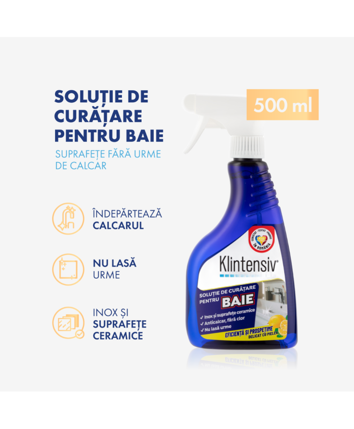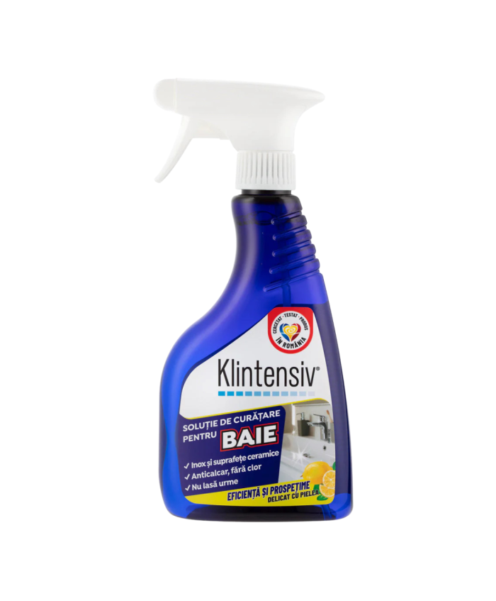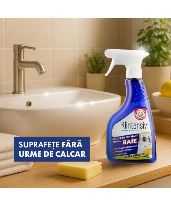 Klintensiv Soluție Curățare Baie 500 mlSoluție profesională pentru îndepărtarea rapidă a calcarului, urmelor de apă și murdăriei din baie. Curăță eficient fără a lăsa urme și protejează suprafețele împotriva re-depunerilor, menținând strălucirea mai mult timp.BeneficiiÎndepărtează calcarul & murdăria fără efortNu lasă urme – aspect îngrijit, luciosCompatibilă cu: gresie, faianță, ceramică, căzi, cabine de duș, robinete/bateriiEfect de protecție împotriva re-depunerilorPotrivită pentru uz casnic & profesional (hoteluri, clinici, spa-uri)Domenii de utilizareCurățarea suprafețelor dure din baie: pereți placați, căzi, cabine de duș, lavoare, baterii/robinete, obiecte sanitare.Instrucțiuni de utilizarePulverizați pe suprafața rece și uscată sau ușor umezită.Lăsați să acționeze 1–3 minute (nu lăsați să se usuce pe suprafață).Frecați ușor dacă este necesar (burete/moale).Clătiți bine cu apă și ștergeți pentru un finisaj fără urme.Pentru depuneri persistente: repetați aplicarea sau prelungiți timpul de acțiune, testând în prealabil pe o zonă puțin vizibilă.Compatibilitate & recomandăriSigură pentru gresie, faianță, ceramică, sticlă tratată, inox (baterii/robinete).Test de compatibilitate pe o zonă mică înainte de prima utilizare.Nu utilizați pe: marmură, piatră naturală calcaroasă, suprafețe sensibile la acizi sau email vechi degradat.Avertizări & precauțiiNu amestecați cu înălbitori/hipoclorit sau alte produse chimice.Utilizați mănuși; evitați contactul prelungit cu pielea și ochii.Asigurați ventilarea încăperii în timpul utilizării.A nu se lăsa la îndemâna copiilor.În caz de contact cu ochii, clătiți imediat cu multă apă.Nu ingerați.Siguranță în utilizareNu utilizați produsul dacă este expirat sau în condiții diferite de cele recomandate pe etichetă/fișa tehnică.Ambalare & logisticăFlacon: 500 ml Durabilitate & depozitareDepozitați în recipientul original, bine închis, la 5–30°C, ferit de îngheț și de soare direct.Folosiți în intervalul indicat de PAO/lot de pe ambalaj...