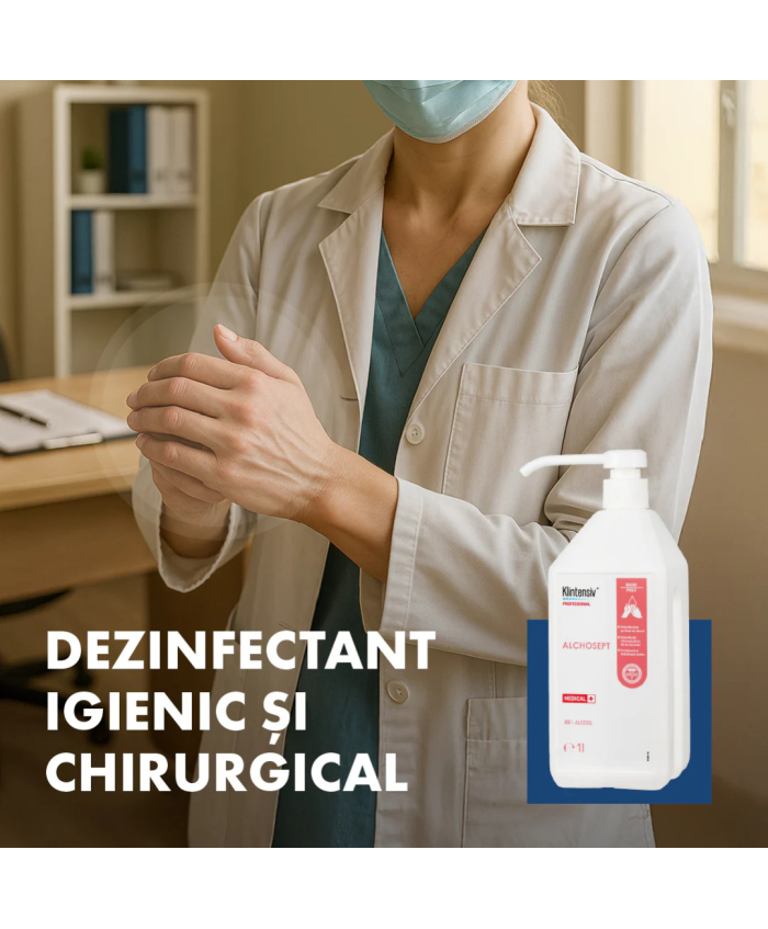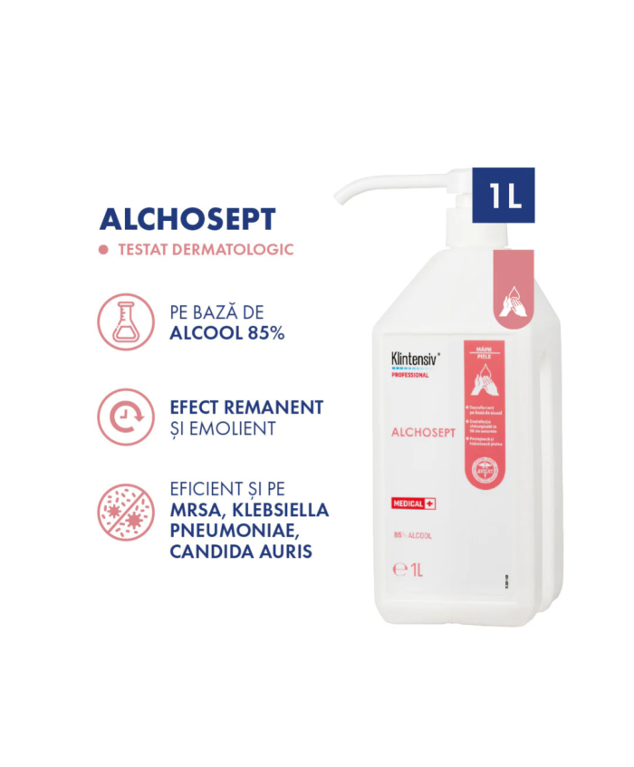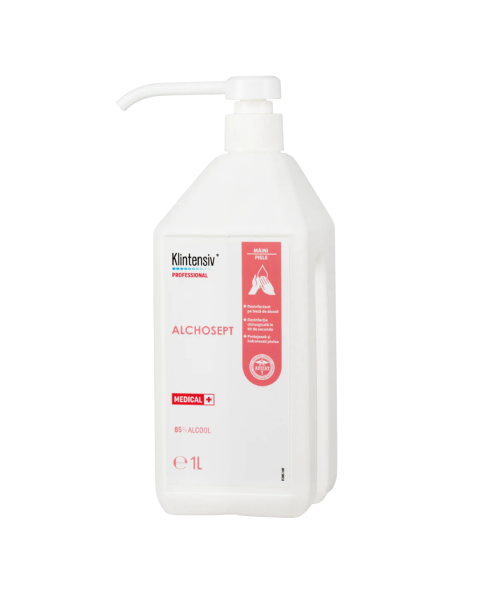 Alchosept Dezinfectant Profesional pentru Mâini și Piele cu Alcool 85% - 1LConceput pentru utilizare frecventă în medii medicale cu standarde stricte de igienă a mâinilor.Produsul este un lichid indicat pentru dezinfectarea igienică și chirurgicală a mâinilor și pielii, prin frecare. Se poate utiliza pentru dezinfecția pielii înainte de intervenții minim invazive precum: puncții, catetere, injecții ș.a.Alchosept este alegerea ideală pentru cei care caută o soluție rapidă de dezinfectare a mâinilor și tegumentelor. Cu o formulă hidroalcoolică pe bază de 85% etanol și ingrediente atent selectionate pentru toleranța cutanată, oferă protecție demonstrată în doar câteva secunde – fără să lase urme sau să usuce pielea.Eficient în spitale, saloane, restaurante sau acasă, Alchosept acționează rapid în fața bacteriilor, fungilor, levurilor, micobacteriilor și virusurilor. Poate fi folosit frecvent, între două activități sau ca parte a rutinei zilnice de igienă.Beneficii principaleDezinfectare igienică în 30 secunde (EN 1500)Dezinfectare chirurgicală în 90 secunde (EN 12791)Efect antimicrobian susținut timp de până la 3 oreSpectru larg: MRSA, Candida auris, Klebsiella pneumoniae, virusuri încapsulateFără clătire, fără urme, fără iritațiiTestat dermatologicPeste 94% ingrediente biodegradabileRecomandat pentruSpitale, clinici, unități mobile, ambulanțeCabinete medicale și stomatologiceSaloane, spa-uri, beauty & wellnessRestaurante, hoteluri, școli, birouriUtilizare personală acasă sau în deplasareDezinfectarea pielii înainte de injecții, puncții, catetere Caracteristici fizico-chimice• Aspect: lichid incolor, translucid• Miros: parfumat, specific de alcool• pH: 7,5 ± 0,5• Solubil în apă ..