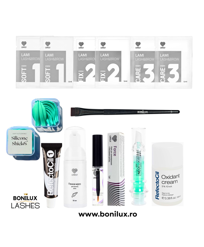 Lovely Kit Laminare Gene si Sprancene Kitul contine:2* Solutie plic Lovely Lash & Brow Nr. 1 Soft2* Solutie plic Lovely Lash & Brow Nr.2 Fix2* Solutie plic Lovely Lash & Brow Nr 3 Care1* Adeziv Laminare Lovely Force 5 ml1* Perie Y Brush Albastra1* Set Bigudiuri Laminare " Lash Flex"3 * Instrument Lash Lifting1* Lovely Lash Neo Botox1* Refectocil Vopsea Crema1* Refectocil Oxidant 3%1* Spuma Curatare Lovely 1* Pensula Sprancene Bonilux1* Recipient amestec vopseaFiecare plic de Solutie Laminare Lovely Lash & Brow are 1.5g si este sufient pentru 5-7 proceduri, cu dozajul corect.Valabilitatea Solutiei Laminare Lovely Lash & Brow este de 72H odata plicul deschis si 12 luni la raft.Solutiile pentru Laminare Lovely Lash & Brow sunt atat pentru gene cat si pentru sprancene.Kitul ( solutiile) ajunge pentru 10-14 proceduri. Restul produselor din kit pentru aproximativ 30 aplicari...