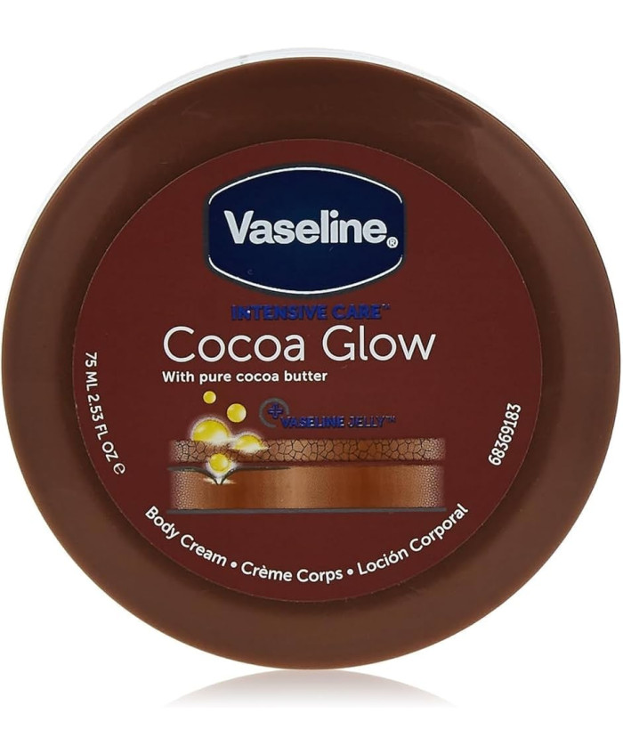Vaseline Cocoa Glow Crema Corp 75mlCrema regeneranta de corp pentru hidratrea pielii uscate.Cu Unt de Cacao pentru redarea hidratarii si stralucirii pielii.Formula cu microparticule gel " Vaseline Jelly "se absoarbe foarte usor in piele si ajuta la vindecarea pielii uscate. Este ideala pentru suprafetele expuse la deshidratare: coate, maini.In acelasi timp aceats formula mentine hidratarea in interiorul pielii, favorizand vindecarea. Se poate utiliza pe arsuri solare, taieturi, ca balsam de buze, si pe calcaiele crapate, deoarece favorizeaza vindecarea.Nu lasa pielea grasa.Mod de utilizare: aplicati pe pielea curata si masati cu miscari circulare pana la absorbtia in piele...